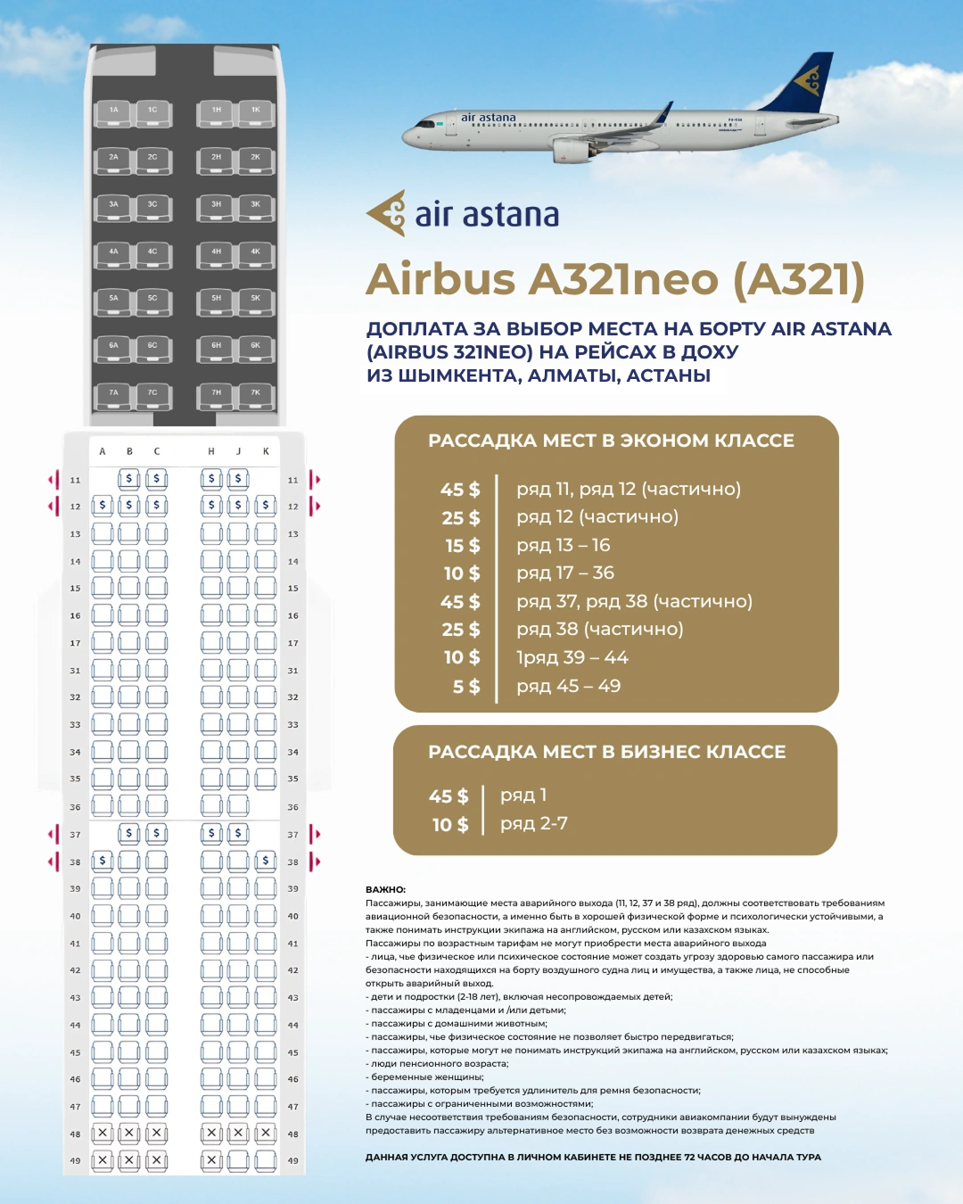 Доплата за выбор места на борту Air Astana (Airbus 321NEO)