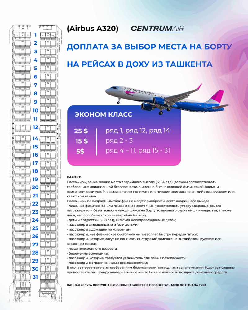 Доплата за выбор места на борту а/к Centrum Air (Airbus A320) на рейсах в Доху из Ташкента
