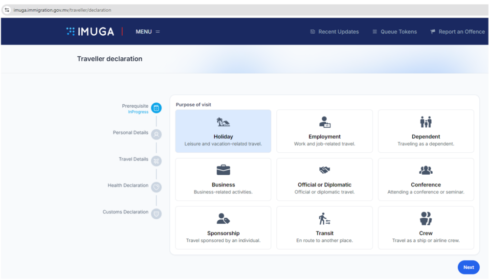 3. Далее необходимо указать цель посещения Мальдивских островов. Выбираем «Holiday» и нажимаем «Next».