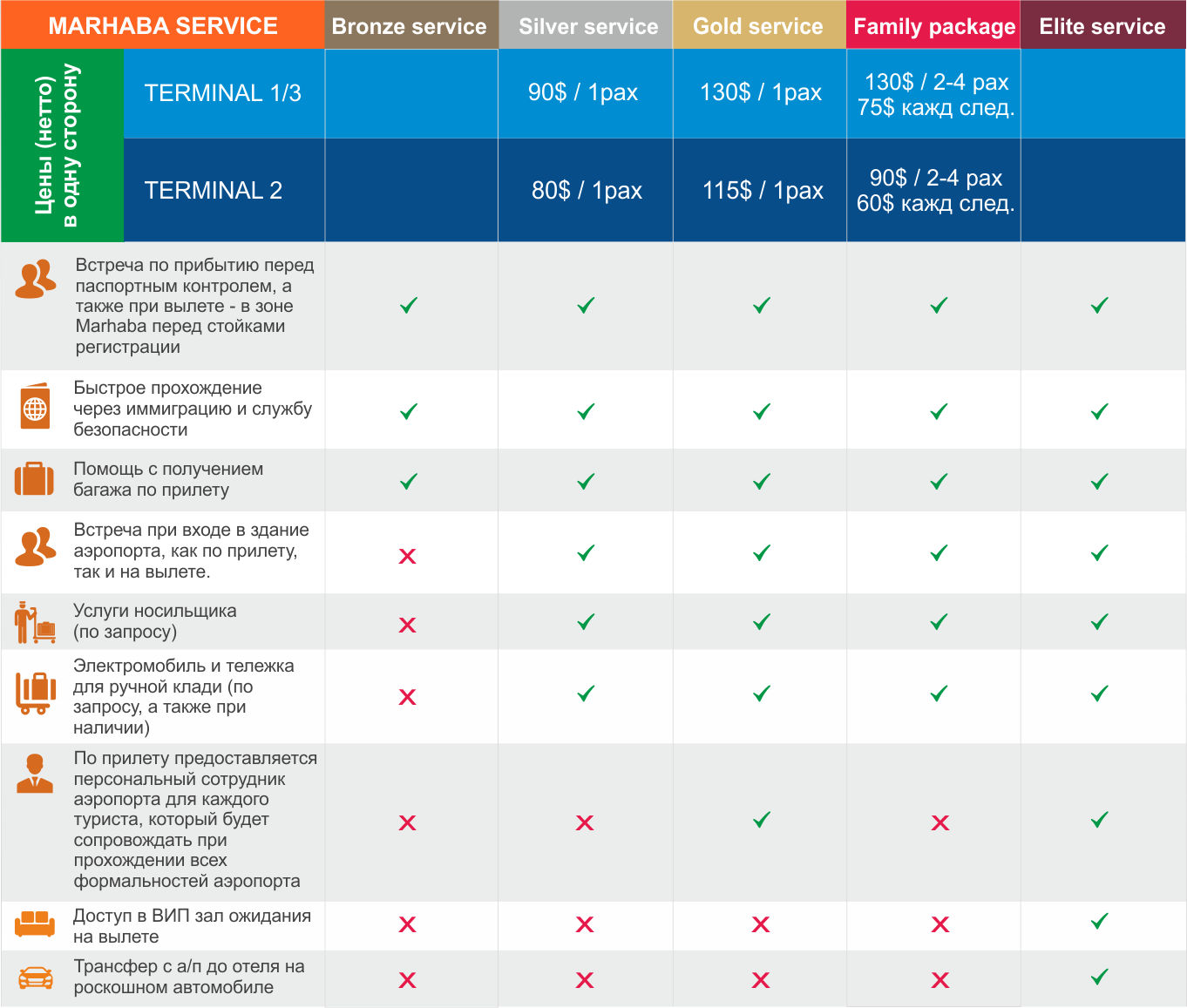 Цены (нетто) даны за услугу в одну сторону, т.е. или за встречу (прилёт), или за проводы (вылет).